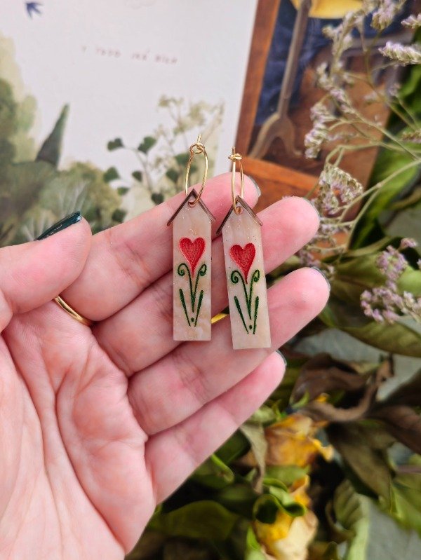 Materiales: Acrilico perlado tallado y pintado a mano, con argollas de acero dorado.