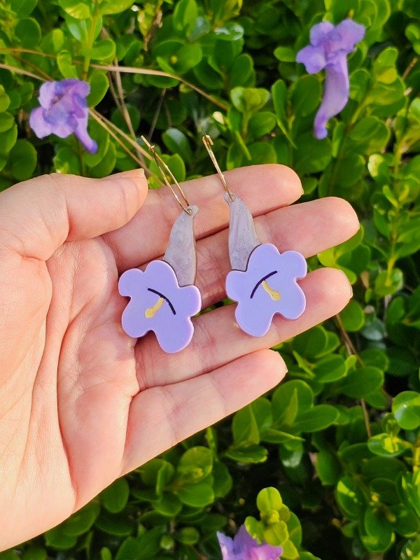 Materiales: Acrilico lila y perlado con argolla de acero dorado/plateado, tallado y pintado a mano.